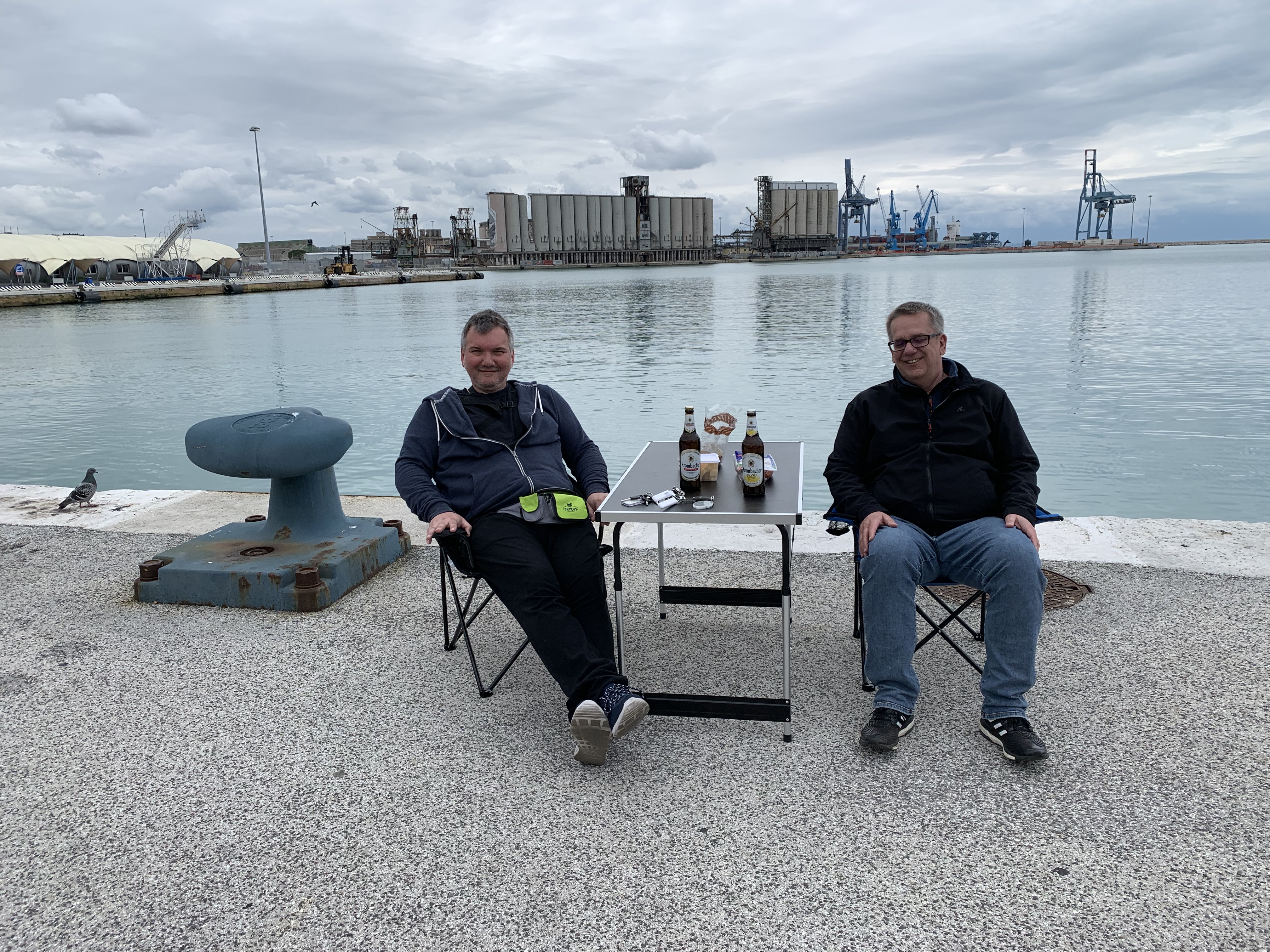 Heute morgen um 7.00 Uhr sind wir dann weiter gefahren. Wir hatten noch 350 km Fahrt vor uns. Alles ging problemlos. Wir hatten auf der Fahrt von Frankfurt nach Ancona nicht einen Stau. Das hatten wir anders erwartet, freuen uns aber umso mehr, dass dem nicht so war. Um 12.30 Uhr haben wir eingecheckt und sitzen jetzt am Anleger und warten auf die Ankunft unserer Fähre, die Cruise Olympia. Um die Wartezeit zu überbrücken, machen wir ein Picknick.