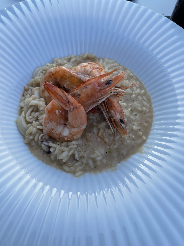 Das Essen im Hotel auf der Terrasse mit Blick aufs Meer, wie immer lecker.