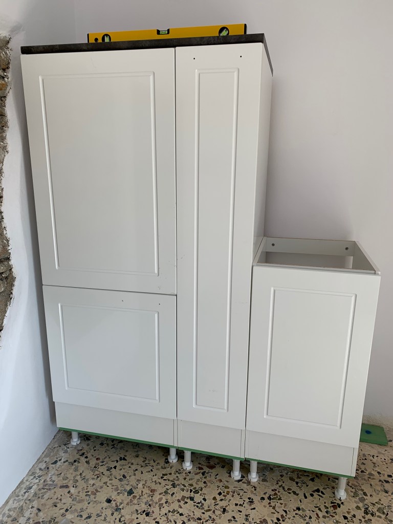 Nach dem Aufbau der ersten beiden Schränke stellten wir fest, dass der Boden eine „leichte“ Neigung von links nach rechts hat, und eine wellenförmige Oberfläche, die den Strukturen eines österreichischen Hochgebirges hatten. Kurz gesagt: alles schepp und krumm!