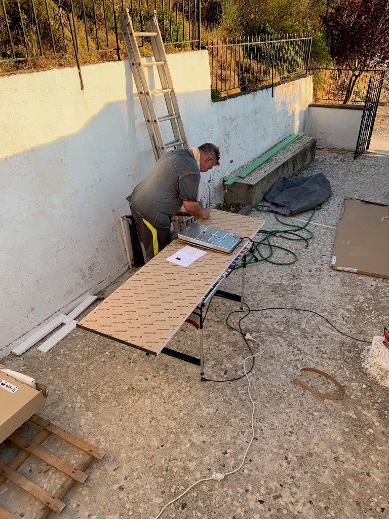 Aufgrund dieser Tatsache, mussten wir uns irgendwie helfen. Also in den Baumarkt in Skyros-Stadt gefahren und gehofft, dass irgendwo auf den 40 Quadratmetern Baumarktgrösse Sockelfüsse zu finden sind. Glück gehabt, tatsächlich gab es welche. Nicht ganz die Höhe, die wir uns gewünscht haben. Seht selbst…..