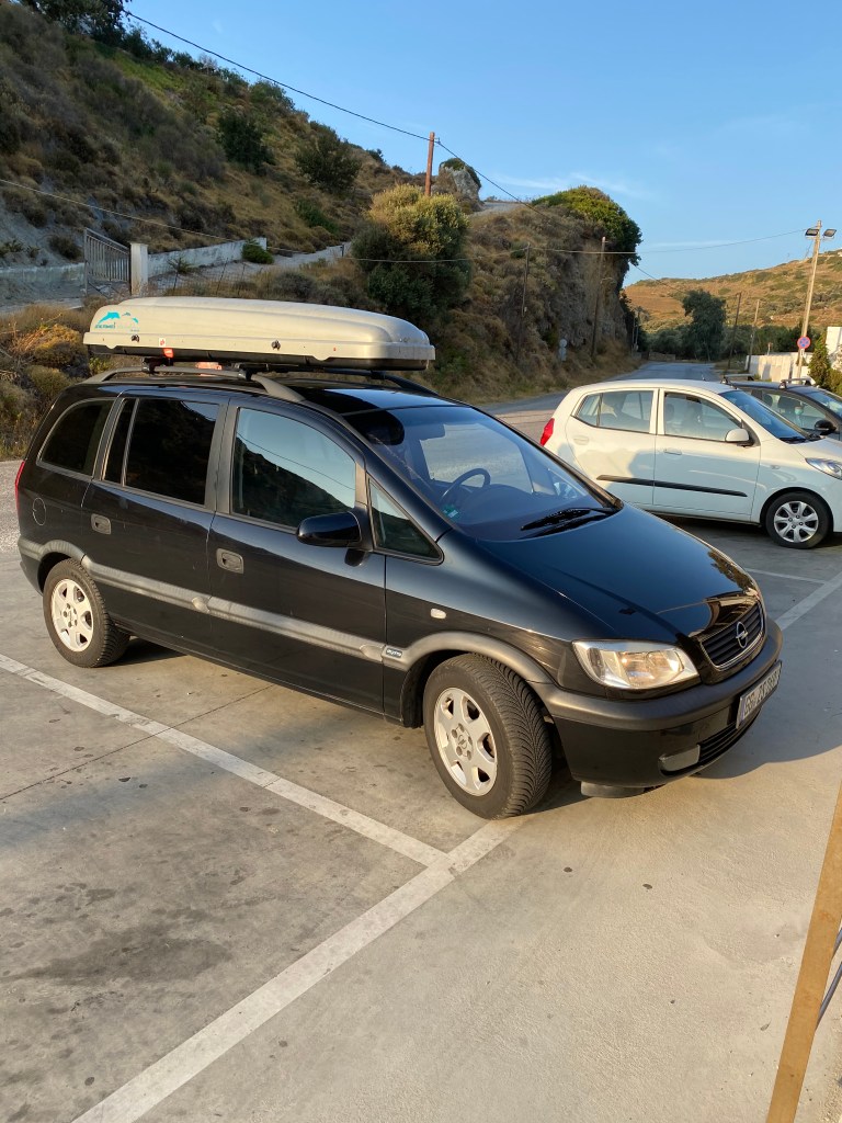 Ich bin pünktlich auf Skyros gelandet, und Jan hat mich mit unserem Urlaubsflitzer für die nächsten Tage am Flughafen abgeholt.