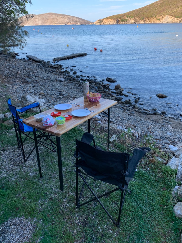 Jan kam dann doch noch. Und richtig, auf direktem Weg sind wir zu „unserem“ Supermarkt gefahren. Einkaufen was Männer so brauchen. Oliven, Chips, Feta, Salami und diverse Getränke. Dann in die Wohnung und ganz entspannt das erste Frühstück in „unserer“ Bucht eingenommen.